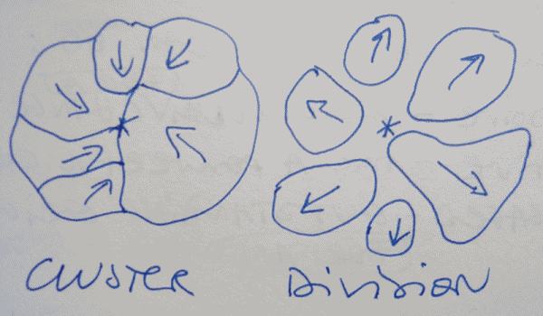 2011 08 12 / B/D / CLUSTER - DIVISION cluster ![]() [ 2011 08 17 / B|D / website written (weblog) division & cluster are a question of scale, the distance between, the ginnungagap where is ginnungagap there is creation possible, but not necessary happening, there has to be demand demand is the will, the space to drow into, the dedicated space for what's coming out of ginnungagap the use, just the use guarantees the safety of demand, without the use it's garbage & it's poison the use is the only sense to be as to make is the only sense to be do you make material, then it is material, do you make virtual then it is virtual >>> virtual fear SCALE GINNUNGAGAP DEMAND USE GARBAGE POISON SENSE MATERIAL VIRTUAL [ 2011 08 16 / B|D / website written (weblog) a CLUSTER is a group of FUNCTIONS, which tend towards a point, a CENTER a DIVISION is a group of FUNCTIONS, which tend outwards a center point og the group a division contains words, which are used traditionally synonym, which are often used in exchange for each other nevertheless those words have nothing in common & shouldn't be used that way words of a division do not replace each other a synonym usage of division words creates a confused understanding of everything a cluster is a group of words, which support each other, complement each other cluster words are also direct opposites either negating each other directly using negating parts like un-, in-, a-, ir- or are positive formulation of such negations ] [ 2011 08 12 / B/D / website written (weblog) clusters & divisions are taking place & act within mind map clusters are words, which form together a common reality & depend on each other divisions are words, which clustering distort reality to a common one synonyms are usually often divisions synonyms are used interchangeably & thus distort reality if the matter is about setting & reaching goals, producing outcomes & results on the other hand clusters are parts of the same matter, which are usually not used as dependend on each other, following each other, sequences, resulting out of each other, conditioning each other contents of clusters support each other & create reality contents of divisions if used as clusters distort each other & reality it's about words, names, the actions which those words indicate & positions from which those words are spoken there isn't any word formulated before there isn't a position attributed ] 2011 08 12 / B clusters & divisions example of a CLUSTER : belief - trust - disbelief (positive needed2) - distrust (positive needed1) - benevolence/good will - disappointment - claim claim driven - gift - loyalty - fear driven - driven/unfree/must/measurement/denominator/ruler - charity - hautiness - hybris - dissect [doubt - 2scepticism - 1suspicion - blame - guilt - culprit - inculpate - punishment - censure - condemn - neglect - ] to clust & to divide changes the rules of the existence literally, it's about the mind map of things, the road map to conduct own life, it has to contain all needed aspects to provide owner success remember : success is when you set a goal virtua, know the skills needed, have the skills set, act & produce tendency 100% goal materia to clust & to divide means : things, which were divided & different matters are then the same recognized from different angles, facettes things, which were exchangeable synonyms are then different matters, which tend to have nothing in common than sheer existence they were divided & they were exchangeable you thought without severe consequences, free of existence distortion, wrongly thought this thought alone's already the resulting distortion of unsufficient generated & thus working, producing irreal views, factual failures more in the same direction means to excuse, to find own view supporting aspects, evidences, remake facts or plainly fabricate "clues" current human brains work mainly within that sector of thinking, it's a tail wagged dog i'm the dog & my brain thinks on itself, leads on, where my life's going & how, does my brain do that cause it's an evil vicious thing ? this idea already is fabricated by that sort of brain-owner constellation, to deprecate oneself is often a successful road to being acknowledged, building trust, being alowed to rule (Uriah Heep) & thus it's a manipulation technique to get where one's heading & what one's aiming at, being slimy builds advantages of freedom to act the human brain is a highly distilled organ, trained & improved through hundreds of thousands of years, working concentrated efficient, our last century endeavors is nothing compared to the past human brain training your response to those words is already the way how your very personal brain is dealing with "inconclusive" material there is literally an infinite amount of possibilities for your brain to get you where you have to be, act & get brainy results what i'm telling here is an overall pointing, which contains a similiar working for the most people, but you have surely your very special cocktail of measures to deal with everything including your pretty box of brainy tricks one good starter to improve your brain relation & interaction between yourself & your organ brain is the vipassana meditation vipassana is a signal to your brain, to point out who's the boss & to tell it, what to do & how, it's just a starter but right direction unlike other organs like liver, eyes or limbs is brain functioning not really efficient if it's just left to work on its own, a brain is like a pointer dog, what's its use to you that it lives free but is untrained & brings you indigestible, even poisonous toads a good working brain needs goals, & its not the job of a brain to create goals, a brain can find you ways to get to goals, can point out what you need to do & which skills you need io to achieve goals, but it's not a brain's job to point sensible & useful goals, it's about values & a pure brain is completely unbiased, for a brain it's equal if you live on or die, now or 