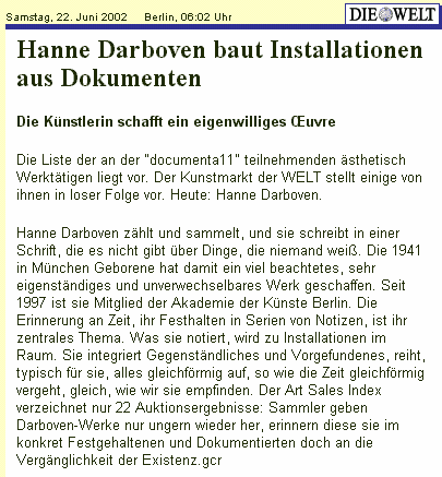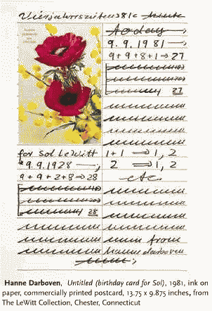 ![]() born 29 april 1941 / died 9 march 2009 the catch 1 : enormously strict conceptual artist consequent, meticulous, puristic, vast with themes around time, writing, numbers, musical notations Schreibzeit festgeschriebene Zeit - Zeiterinnerung writing time - solid written time - time remembrance LINKS : - - - - - - - - - - - - - - - - - - - - Hanne Darboven Foundation Listening to art, watching performance Short Section of Hanne Darboven's Wunschkonzert (1984) performed by cellist Tom Peters - youtube video Proyectos II-Hanne Darboven - youtube video spanish titles SperoneWestwater.com Librairie & Editions Florence Loewy - look under D QUARTETT >88< Art in Context Center Artist-Info - Home numerologic : 29 4 1941 / 11 4 6 / 3 - - - - - - - - - - - - - - - - - - - - horoscope :